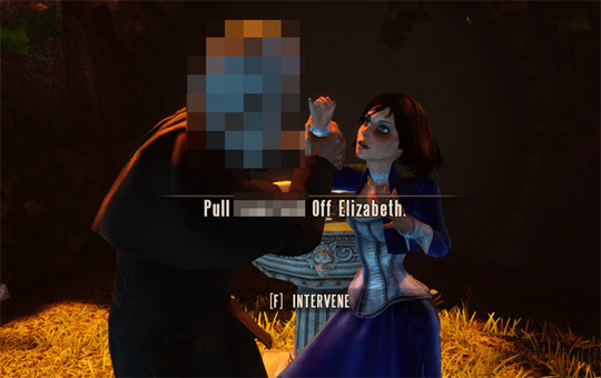 If you wait a bit longer, the game literally scolds you with the same font usually reserved for telling you that you've run out of ammo or that you need to kill some NPCs ("Pull ______ Off Elizabeth. Now.") -- as if this is a fact about the game state, or your new mission objective is just to press a single button on your keyboard with all the strategic nuance that task requires.