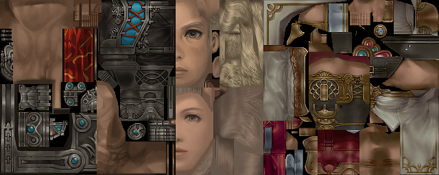 When it first came out 17 years ago (!), the Playstation 2 famously had very little texture memory (4 MB!) and no texture compression (!) which meant developers had to get creative. Loyal readers of this blog know of my love of lightmap atlases and UV layouts, and so I'd like to talk about how the textures for the original Final Fantasy 12 on PS2 were utter masterpieces produced under severe constraints -- cramming so much detail into these small texture sheets, down to the pixels...